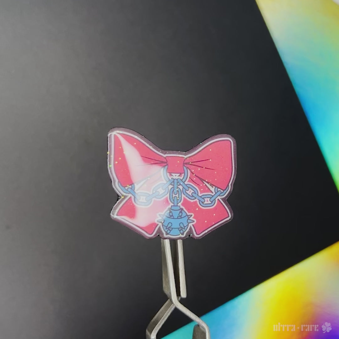 Handmade plastic pin with glitter UV resin finish. Includes two pin backs: rubber and butterfly clutch.