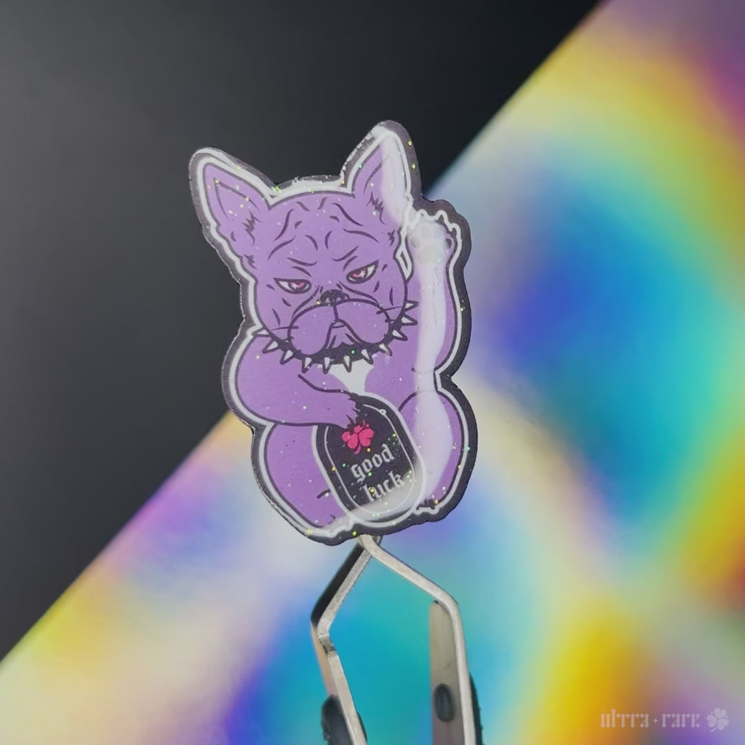 Handmade plastic pin with glitter UV resin finish. Includes two pin backs: rubber and butterfly clutch.