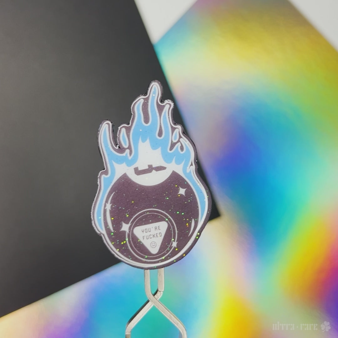 Handmade plastic pin with glitter UV resin finish. Includes two pin backs: rubber and butterfly clutch.